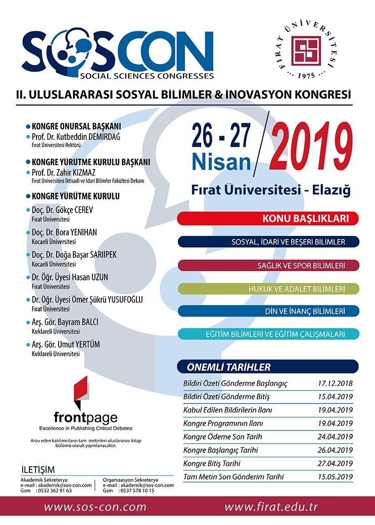 26-28 Nisan 2019 tarihleri arasında Elazığ Fırat Üniversitesi'nde gerçekleştirilece olan kongrede, farklı disiplinlerden akademisyenler Sosyal Bilimler ve İnovasyon ilişksini irdeleyeceklerdir.