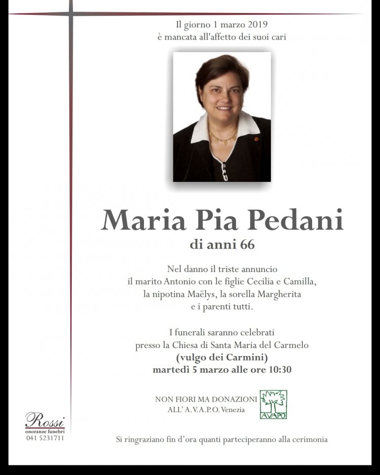 Maria Pia PEDANI Venedik Ca’ Foscari Üniversitesi Yabancı Diller ve Edebiyat bölümü ile Trieste Üniversitesi Beşerî Bilimler Fakültesi’nden mezun oldu. Doktorasını Macaristan Szeged Üniversitesi’nden aldı. 1979’den itibaren 1999’a kadar 20 yıl Venedik Arşivlerinde çalıştıktan sonra 1999’da Venedik Ca’ Foscari Üniversitesi Asya-Kuzey Afrika Çalışmaları Bölümünde doçent oldu. 2003’te Ca’ Foscari Üniversitesi’nde Osmanlı İmparatorluğu Tarihi derslerine başladı. 2004’de Türk Üniversiteleriyle kendi bölümü arasında ilk Erasmus değişim programı anlaşmalarını imzaladı. Bu sayede pekçok Türk öğrenci kendi danışmanlığında Venedik’te eğitim imkânı buldu. Buna mukabil pekçok İtalyan öğrenci de Türkiye’ye geldi. Daha ziyade XIV-XVIII. asırlar arasındaki Osmanlı tarihi üzerine yoğunlaştı. Osmanlı vesikaları üzerinden diplomasi, Barış Andlaşmaları, Hudud Anlaşmaları ve Venedik-Osmanlı münasebetlerini çalıştı.